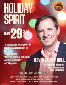 Come celebrate the season with Hall at the Hall! Join cabaret singer and storyteller Kevin Scott Hall for a festive holiday concert at Leominster City Hall. An afternoon of music and cheer sure to put you in the holiday spirit, proudly sponsored by City on a Hill Arts!